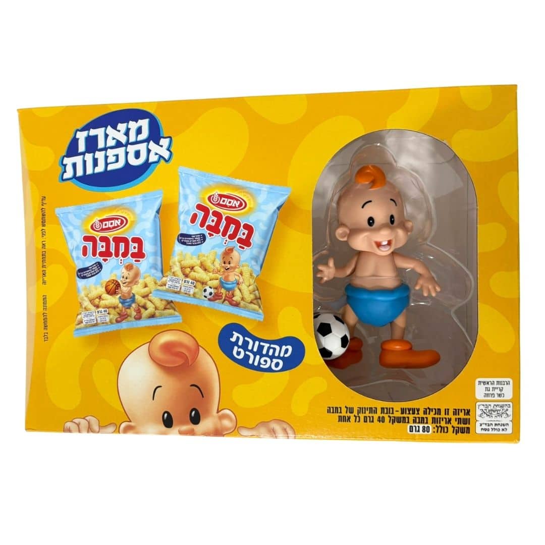 במבה מארז אספנות: האריזה מכילה צעצוע – בובת התינוק של במבה, שתי אריזות במבה אסם במשקל 40 גרם כל אחת.