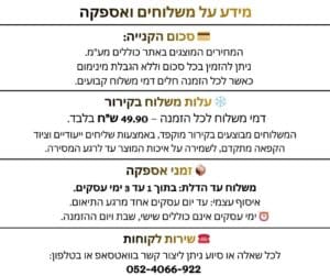 משלוח בהקפאה עם שליח עד הבית: 49.90 שקלים בכל הזמנה.